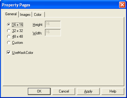 - Pada Tab “General” kita dapat memilih ukuran dari besar tombol yang akan kita gunakan, untuk pertama coba kita pilih ukuran 16 x 16 terlebih dahulu, lalu pindah ke Tab “Images”. Seperti pada gambar berikut :